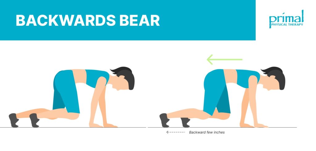 From the A-Frame position, with straight arms and legs, slide opposite arms and legs backward a few inches. Avoid bending the knees or elbows; keep the hips high and heels relaxed. The base arm is going to drive the backward momentum, engaging abdominals and shoulder stabilizers.