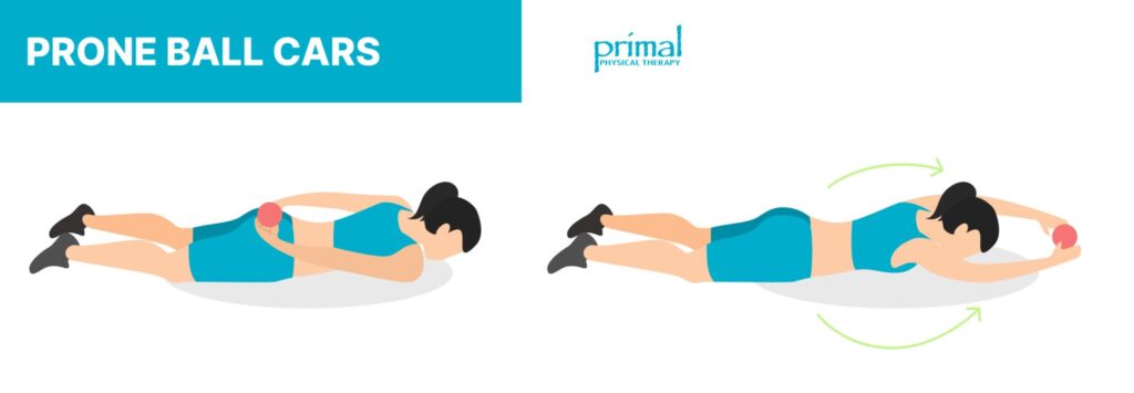 From a prone position, pass an object (small ball or small light object) from hand to hand overhead and then behind your back. When you pass it overhead, your eyes should be looking at it. When you pass it behind your lower back, bring your head to neutral. Do CW, then CCW for this move.